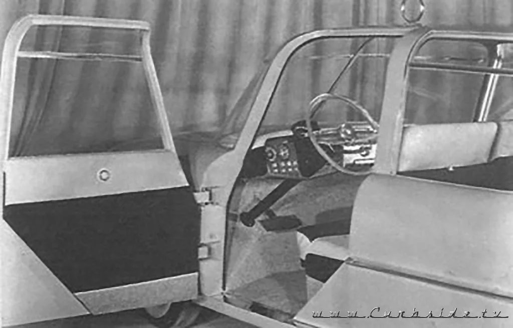 The Plainsman’s radical powertrain was projected to deliver a 30 M.P.G. rating when that was amazing. With its lightweight aluminum body weighing in at 2200 lbs., it was projected to be capable of reaching 160 M.P.H. Driven by an electric motor at each wheel relying on energy supplied by a small gasoline-powered generator, the Plainsman was like a Chevrolet Volt, minus the storage batteries. It featured an in-dash miles per gallon read-out and a height-adjustable suspension. Its electric motors reversed polarity as a means of braking. The Plainsman’s generator was said to be a rear mounted, air-cooled “pancake” or “boxer” engine borrowed from a Beechcraft airplane.